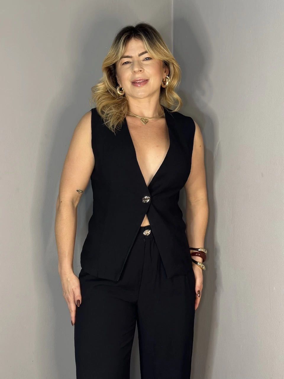 Elegância, sofisticação e acabamento impecável. Nosso conjunto de alta alfaiataria é composto por colete e calça estruturados.Ideal para compor looks formais, modernos ou até produções fashionistas com atitude. Essa combinação oferece conforto sem abrir mão do caimento perfeito. Com corte estruturado, a dupla garante um visual sofisticado e cheio de estilo. Use as peças juntas para uma proposta poderosa e atual, ou combine separadamente: o colete vai bem com jeans para um look descolado, e a calça é perfeita com camisetas básicas ou camisas para composições versáteis, do trabalho ao jantar.