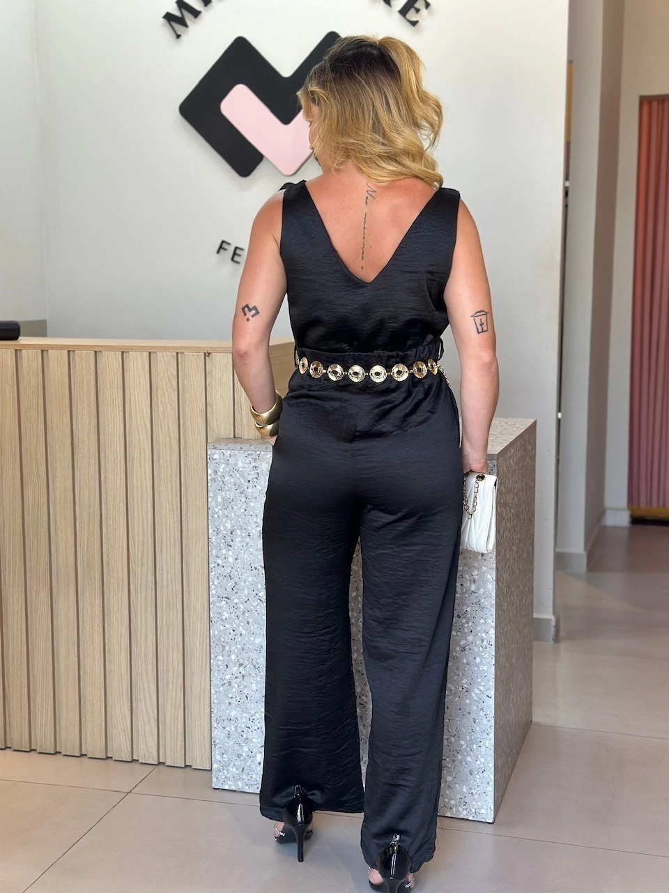 Com design sofisticado e caimento impecável, o Macacão é a peça perfeita para unir conforto e elegância em uma única produção. Confeccionado em tecido encorpado com leve elasticidade ele valoriza a silhueta sem abrir mão da liberdade de movimento.Uma peça versátil que transita com facilidade entre o casual chic e o look para eventos,basta mudar os acessórios para transformar a produção.Use com sandálias de salto e clutch para um visual mais elegante, ou combine com tênis e jaqueta jeans para uma proposta urbana e despojada.