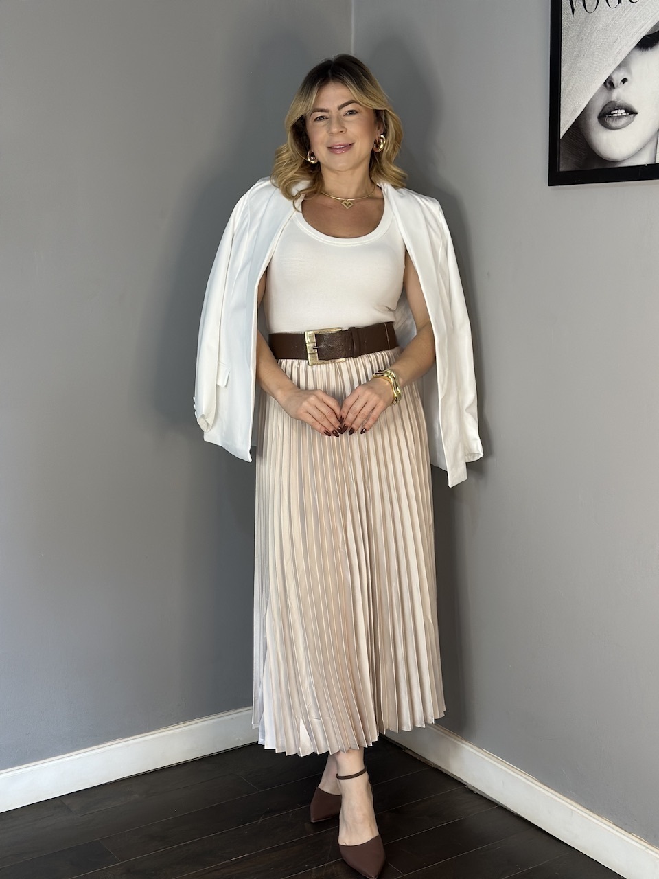 Versátil e atemporal, a saia plissada alongada é a peça-chave para compor looks elegantes e modernos. A saia plissada é uma peça cheia de movimento e elegância, perfeita para compor looks versáteis com um toque sofisticado. Combine com blusas ajustadas ou camisas para um visual mais clássico, ou use com t-shirts e tênis para uma proposta moderna e despojada. Nos dias mais frescos, aposte em jaquetas ou tricôs leves para um look confortável e estiloso em qualquer ocasião.